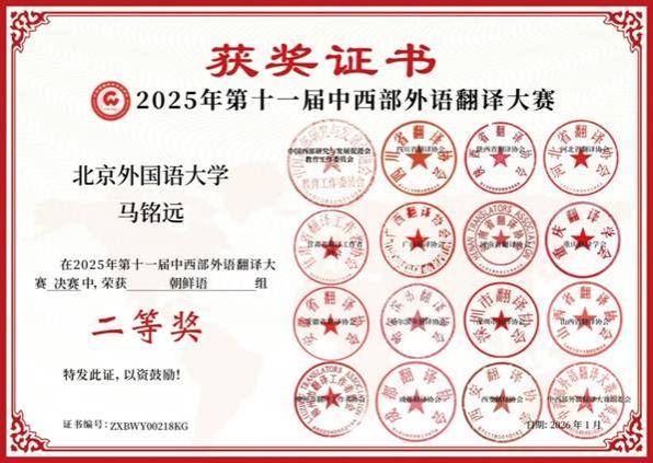 朝鲜语专业2025级本科学生马铭远斩获二等奖的佳绩。